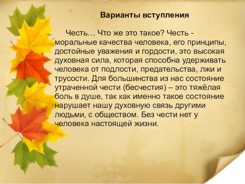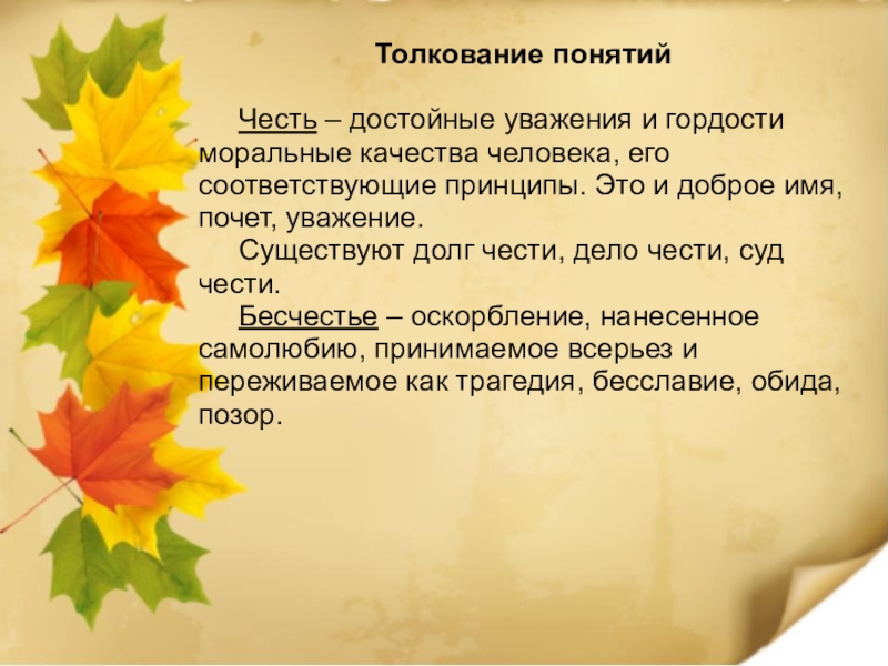 его принципы, достойные уважения и гордости, это высокая духовная сила, которая способна удерживать человека от подлости, предательства, лжи и трусости. Для большинства из нас состояние утраченной чести (бесчестия) – это тяжёлая боль в душе, так как именно такое состояние нарушает нашу духовную связь другими людьми, с обществом. Без чести нет у человека настоящей жизни.