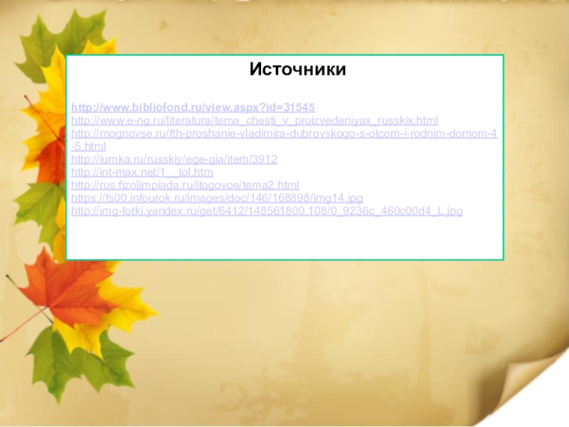 Владимир Дубровский: «бесчестие» - оставить без отмщения, без наказания не праведный поступок, стерпеть беззаконие.