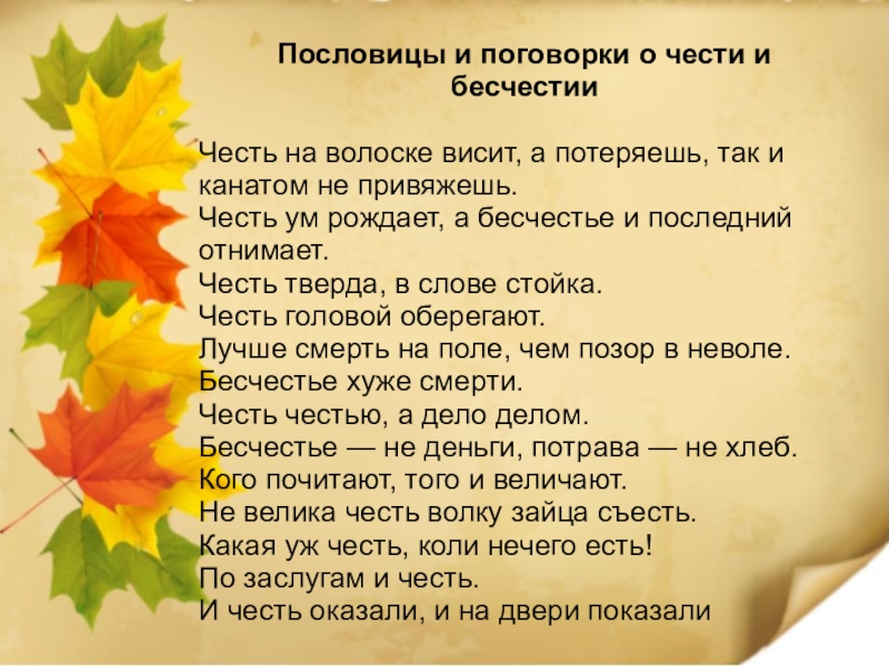 Слайд 5Пословицы и поговорки о чести и бесчестии