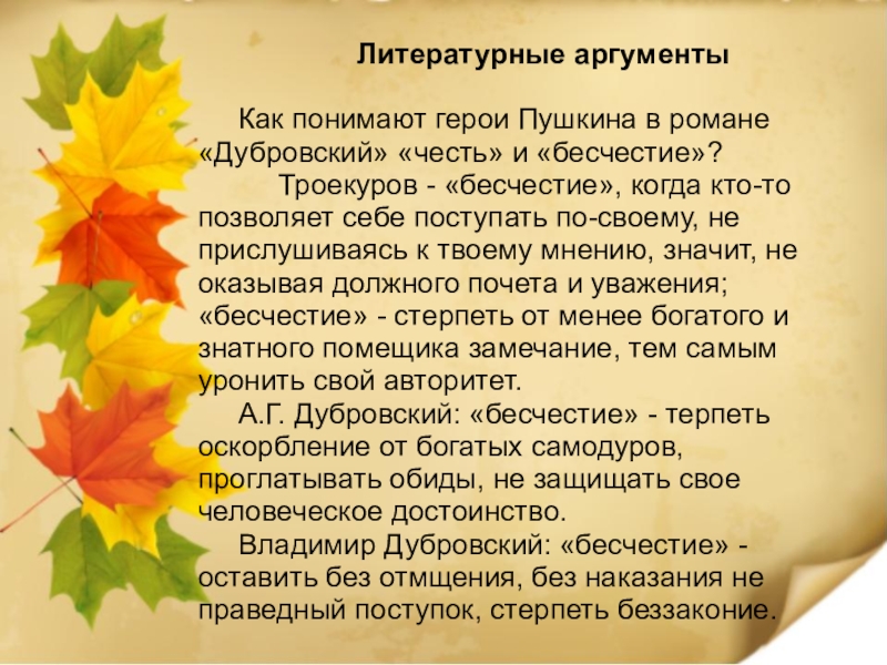 А.Г. Дубровский: «бесчестие» - терпеть оскорбление от богатых самодуров, проглатывать обиды, не защищать свое человеческое достоинство.