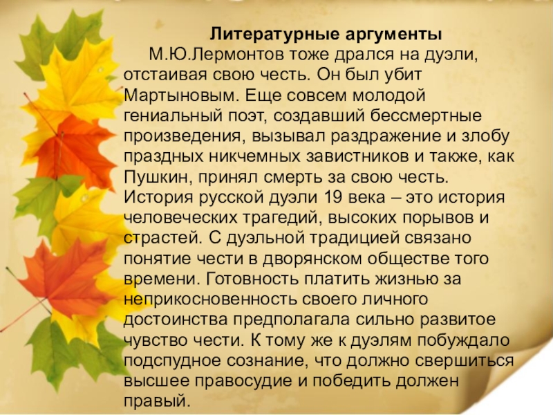 М.Ю.Лермонтов тоже дрался на дуэли, отстаивая свою честь. Он был