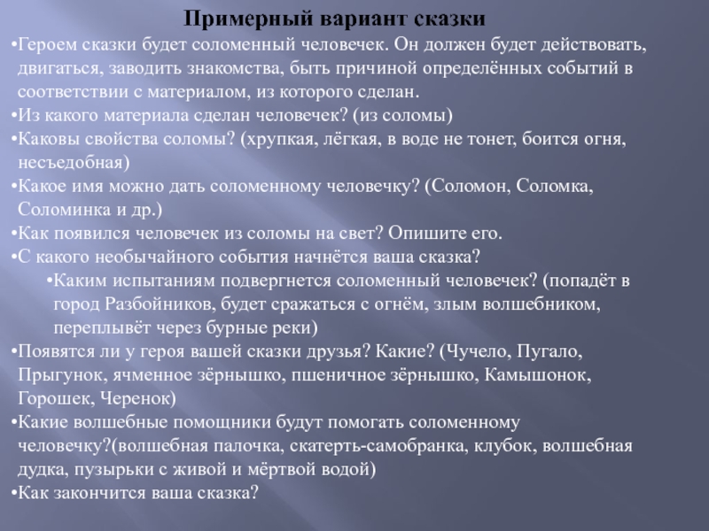 Героем сказки будет соломенный человечек. Он должен будет действовать, двигаться, заводить знакомства, быть причиной определённых событий в соответствии с материалом, из которого сделан.