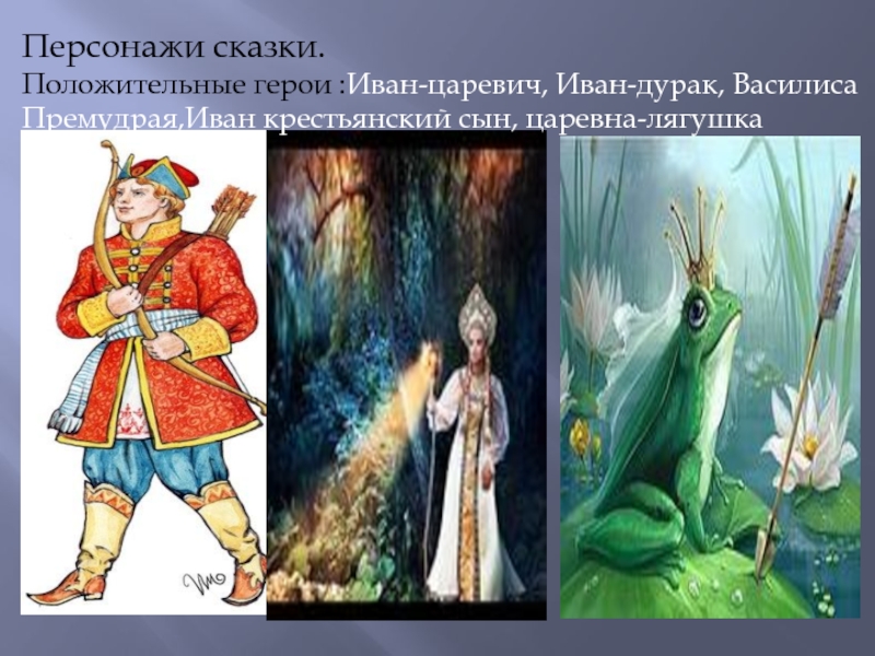 Положительные герои :Иван-царевич, Иван-дурак, Василиса Премудрая,Иван крестьянский сын, царевна-лягушка