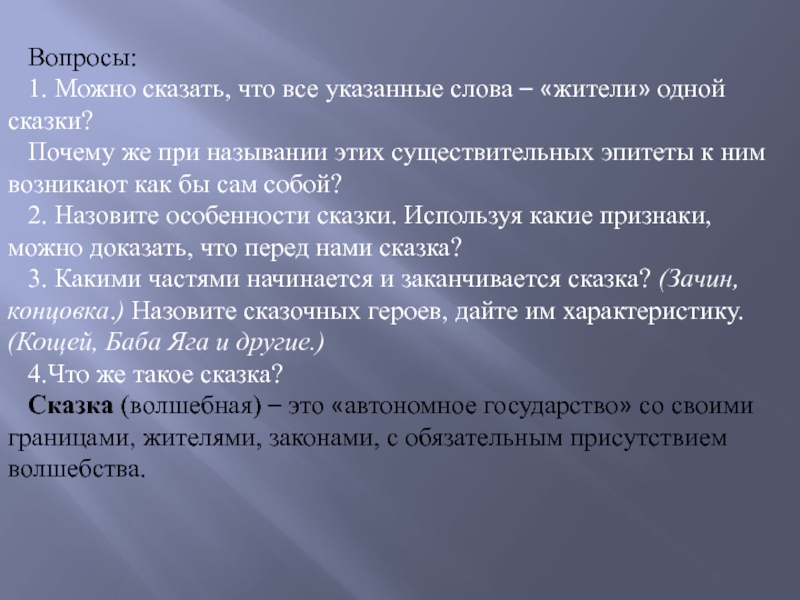 Сказка (волшебная) – это «автономное государство» со своими границами, жителями, законами, с обязательным присутствием волшебства.