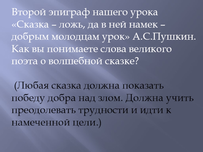 Слайд 15Второй эпиграф нашего урока «Сказка – ложь, да в ней намек