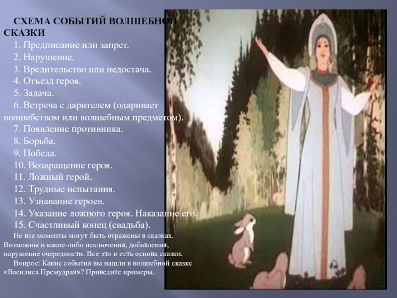 Вопрос: Какие события вы нашли в волшебной сказке «Василиса Премудрая»? Приведите примеры.