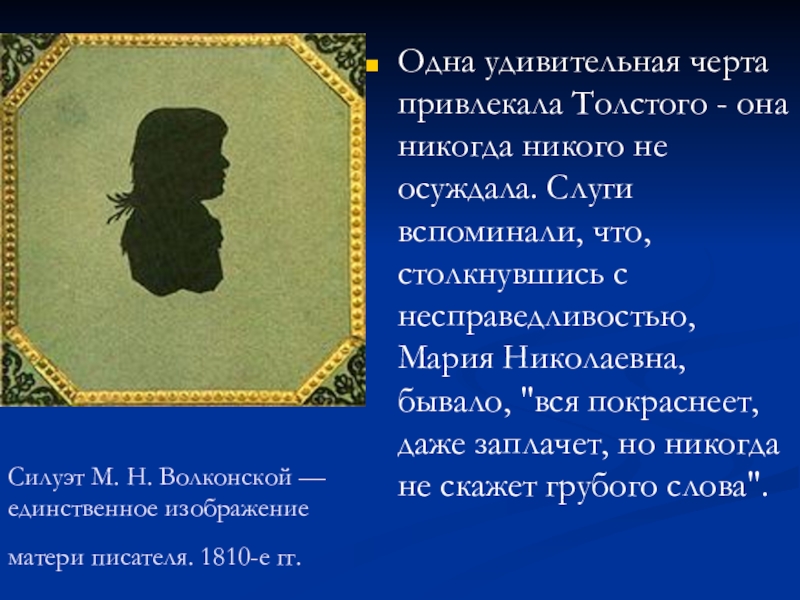 Слайд 5Силуэт М. Н. Волконской — единственное изображение матери писателя. 1810-е гг.