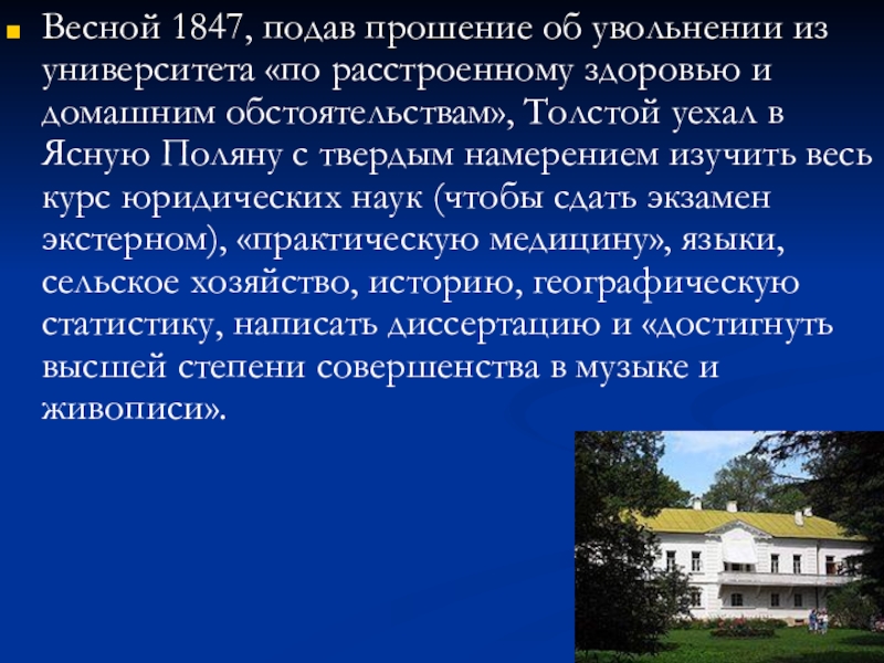 и домашним обстоятельствам», Толстой уехал в Ясную Поляну с твердым намерением изучить весь курс юридических наук (чтобы сдать экзамен экстерном), «практическую медицину», языки, сельское хозяйство, историю, географическую статистику, написать диссертацию и «достигнуть высшей степени совершенства в музыке и живописи».