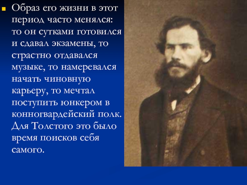 готовился и сдавал экзамены, то страстно отдавался музыке, то намеревался начать чиновную карьеру, то мечтал поступить юнкером в конногвардейский полк. Для Толстого это было время поисков себя самого.