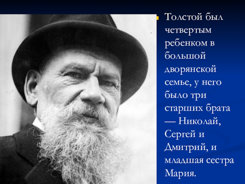 Слайд 3Толстой был четвертым ребенком в большой дворянской семье, у него было