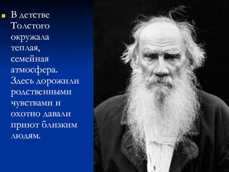 Слайд 8В детстве Толстого окружала теплая, семейная атмосфера. Здесь дорожили родственными чувствами