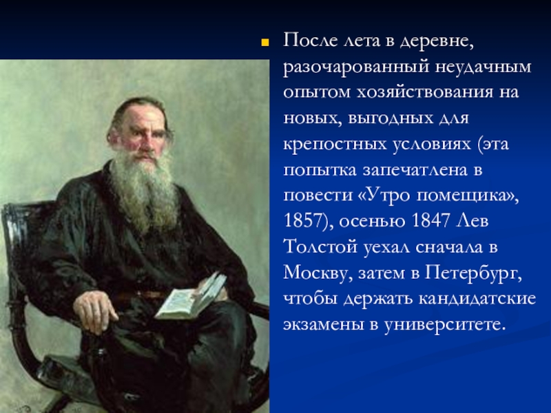 для крепостных условиях (эта попытка запечатлена в повести «Утро помещика», 1857), осенью 1847 Лев Толстой уехал сначала в Москву, затем в Петербург, чтобы держать кандидатские экзамены в университете.