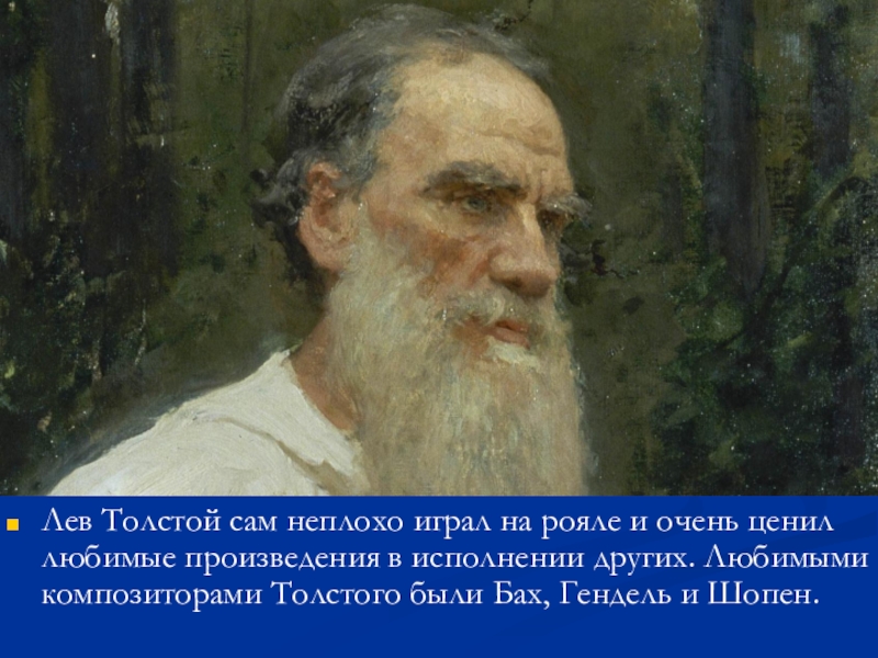 произведения в исполнении других. Любимыми композиторами Толстого были Бах, Гендель и Шопен.