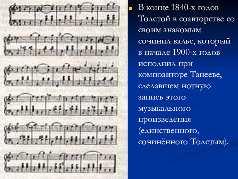 вальс, который в начале 1900-х годов исполнил при композиторе Танееве, сделавшем нотную запись этого музыкального произведения (единственного, сочинённого Толстым).