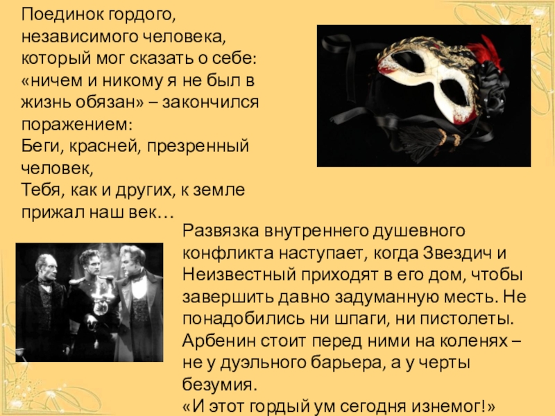 „Формуле“ этой противостоит гордое арбенинское: „Мне поздно перед ними гнуться...“, „Ничем и никому я не был в жизнь обязан“.