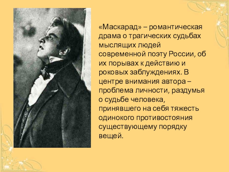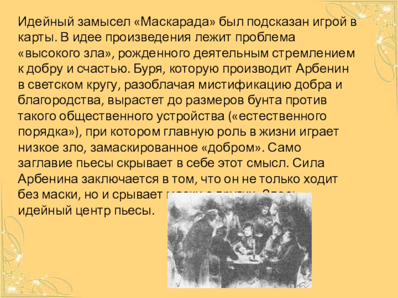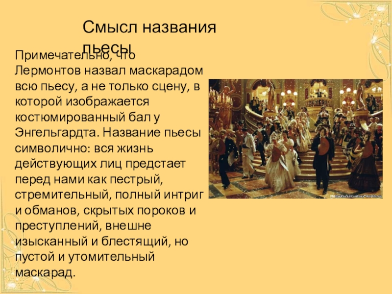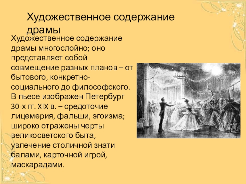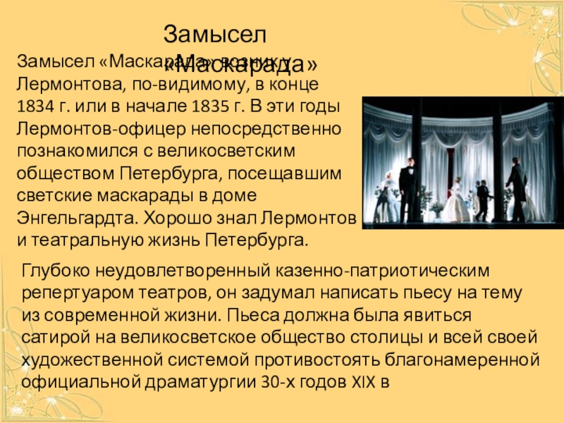 Замысел «Маскарада» возник у Лермонтова, по-видимому, в конце 1834 г. или в начале 1835 г. В эти годы Лермонтов-офицер непосредственно познакомился с великосветским обществом Петербурга, посещавшим светские маскарады в доме Энгельгардта. Хорошо знал Лермонтов и театральную жизнь Петербурга.