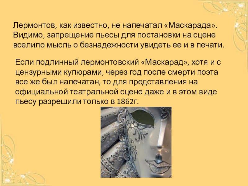 Если подлинный лермонтовский «Маскарад», хотя и с цензурными купюрами, через год после смерти поэта все же был напечатан, то для представления на официальной театральной сцене даже и в этом виде пьесу разрешили только в 1862г.