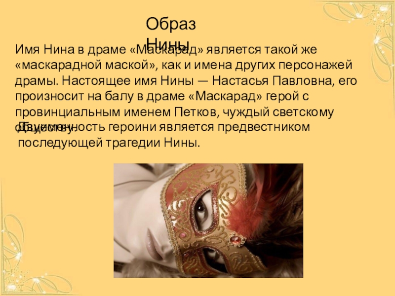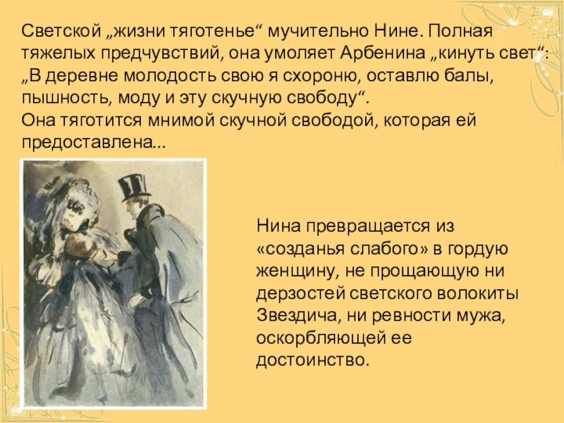 Нина превращается из «созданья слабого» в гордую женщину, не прощающую ни дерзостей светского волокиты Звездича, ни ревности мужа, оскорбляющей ее достоинство.