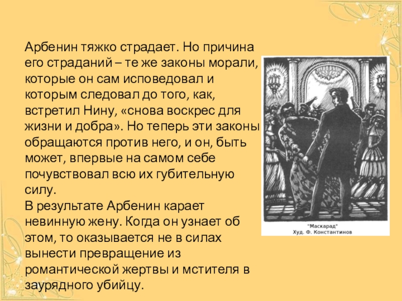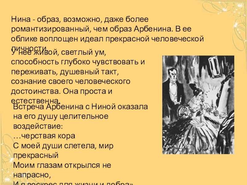 Встреча Арбенина с Ниной оказала на его душу целительное воздействие: