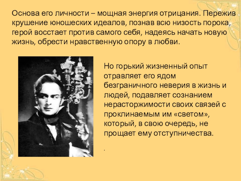 Основа его личности – мощная энергия отрицания. Пережив крушение юношеских идеалов, познав всю низость порока, герой восстает против самого себя, надеясь начать новую жизнь, обрести нравственную опору в любви.