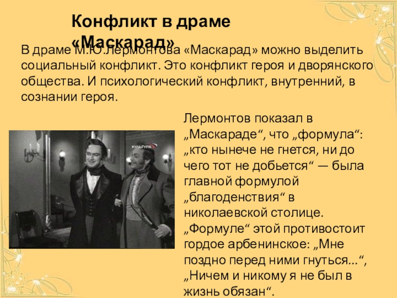 Лермонтов показал в „Маскараде“, что „формула“: „кто нынече не гнется, ни до чего тот не добьется“ — была главной формулой „благоденствия“ в николаевской столице.