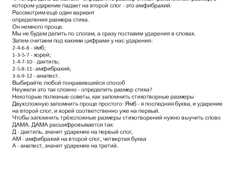 Чтобы запомнить трёхсложные размеры стихотворений нужно выучить слово ДАМА. ДАМА расшифровывается так: