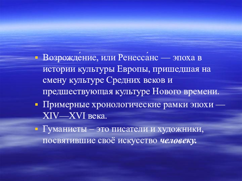 Слайд 5Возрожде́ние, или Ренесса́нс — эпоха в истории культуры Европы, пришедшая на