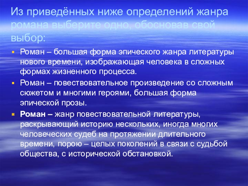 Слайд 21Из приведённых ниже определений жанра романа выберите одно, обосновав свой выбор: