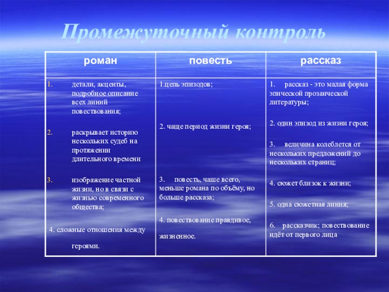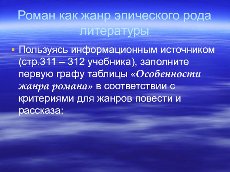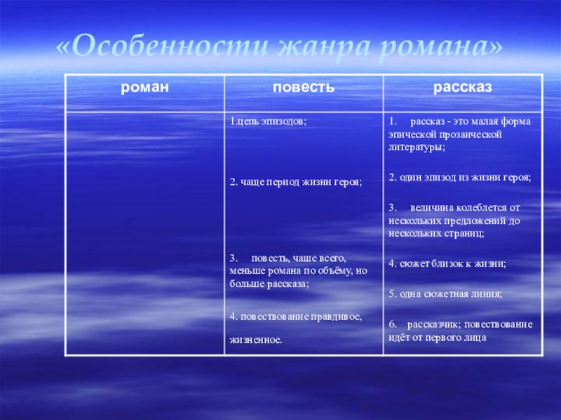 учебника), заполните первую графу таблицы «Особенности жанра романа» в соответствии с критериями для жанров повести и рассказа: