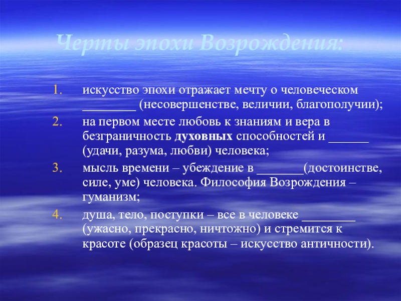мысль времени – убеждение в _______(достоинстве, силе, уме) человека. Философия Возрождения – гуманизм;