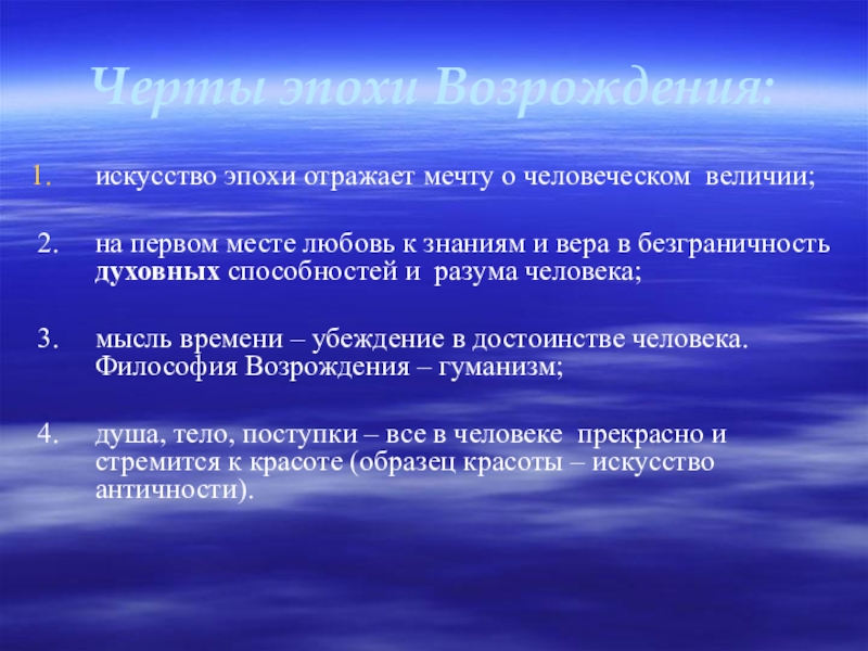 4. душа, тело, поступки – все в человеке прекрасно и стремится к красоте (образец красоты – искусство античности).