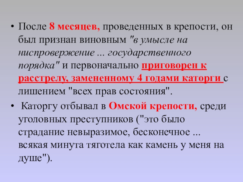 Каторгу отбывал в Омской крепости, среди уголовных преступников ("это было страдание невыразимое, бесконечное ... всякая минута тяготела как камень у меня на душе").