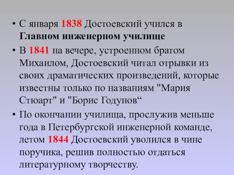 Слайд 9С января 1838 Достоевский учился в Главном инженерном училище