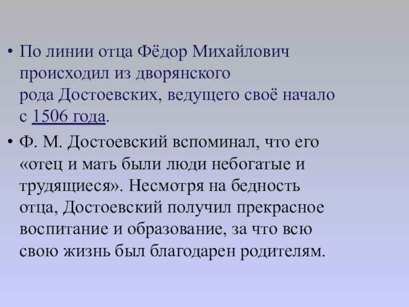 Ф. М. Достоевский вспоминал, что его «отец и мать были люди небогатые и трудящиеся». Несмотря на бедность отца, Достоевский получил прекрасное воспитание и образование, за что всю свою жизнь был благодарен родителям.
