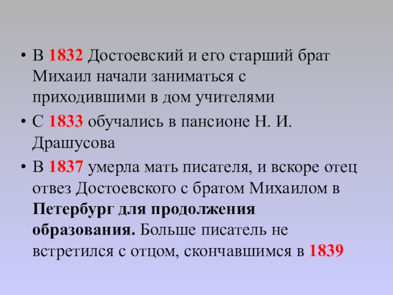 В 1837 умерла мать писателя, и вскоре отец отвез Достоевского с братом Михаилом в Петербург для продолжения образования. Больше писатель не встретился с отцом, скончавшимся в 1839