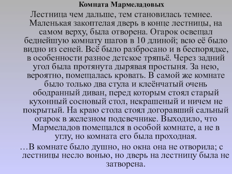 конце лестницы, на самом верху, была отворена. Огарок освещал беднейшую комнату шагов в 10 длиной; всю её было видно из сеней. Всё было разбросано и в беспорядке, в особенности разное детское тряпьё. Через задний угол была протянута дырявая простыня. За нею, вероятно, помещалась кровать. В самой же комнате было только два стула и клеёнчатый очень ободранный диван, перед которым стоял старый кухонный сосновый стол, некрашеный и ничем не покрытый. На краю стола стоял догоравший сальный огарок в железном подсвечнике. Выходило, что Мармеладов помещался в особой комнате, а не в углу, но комната его была проходная.