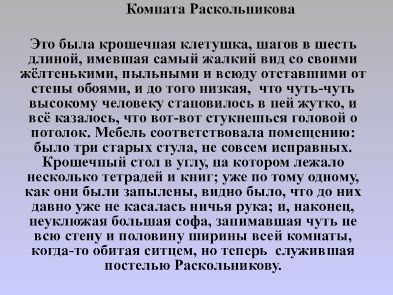 была крошечная клетушка, шагов в шесть длиной, имевшая самый жалкий вид со своими жёлтенькими, пыльными и всюду отставшими от стены обоями, и до того низкая, что чуть-чуть высокому человеку становилось в ней жутко, и всё казалось, что вот-вот стукнешься головой о потолок. Мебель соответствовала помещению: было три старых стула, не совсем исправных. Крошечный стол в углу, на котором лежало несколько тетрадей и книг; уже по тому одному, как они были запылены, видно было, что до них давно уже не касалась ничья рука; и, наконец, неуклюжая большая софа, занимавшая чуть не всю стену и половину ширины всей комнаты, когда-то обитая ситцем, но теперь служившая постелью Раскольникову.