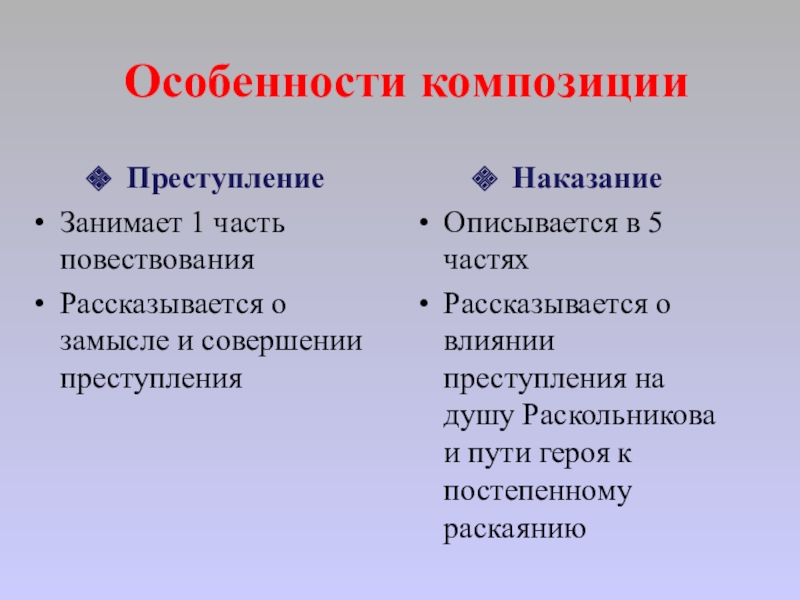 Рассказывается о влиянии преступления на душу Раскольникова и пути героя к постепенному раскаянию