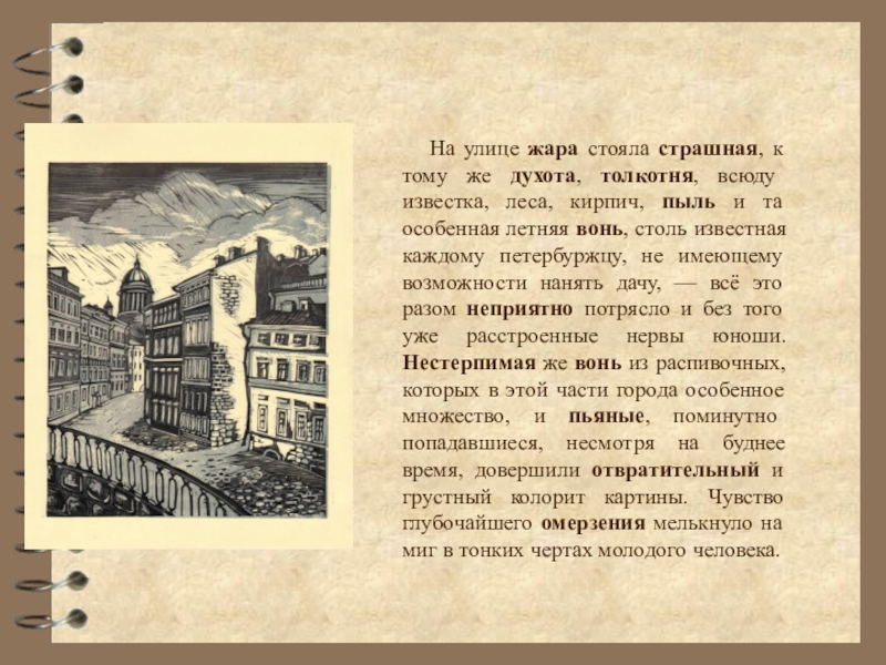 толкотня, всюду известка, леса, кирпич, пыль и та особенная летняя вонь, столь известная каждому петербуржцу, не имеющему возможности нанять дачу, — всё это разом неприятно потрясло и без того уже расстроенные нервы юноши. Нестерпимая же вонь из распивочных, которых в этой части города особенное множество, и пьяные, поминутно попадавшиеся, несмотря на буднее время, довершили отвратительный и грустный колорит картины. Чувство глубочайшего омерзения мелькнуло на миг в тонких чертах молодого человека.