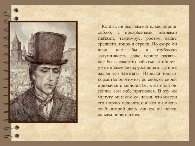 глазами, темно-рус, ростом выше среднего, тонок и строен. Но скоро он впал как бы в глубокую задумчивость, даже, вернее сказать, как бы в какое-то забытье, и пошел, уже не замечая окружающего, да и не желая его замечать. Изредка только бормотал он что-то про себя, от своей привычки к монологам, в которой он сейчас сам себе признался. В эту же минуту он и сам сознавал, что мысли его порою мешаются и что он очень слаб: второй день как уж он почти совсем ничего не ел.