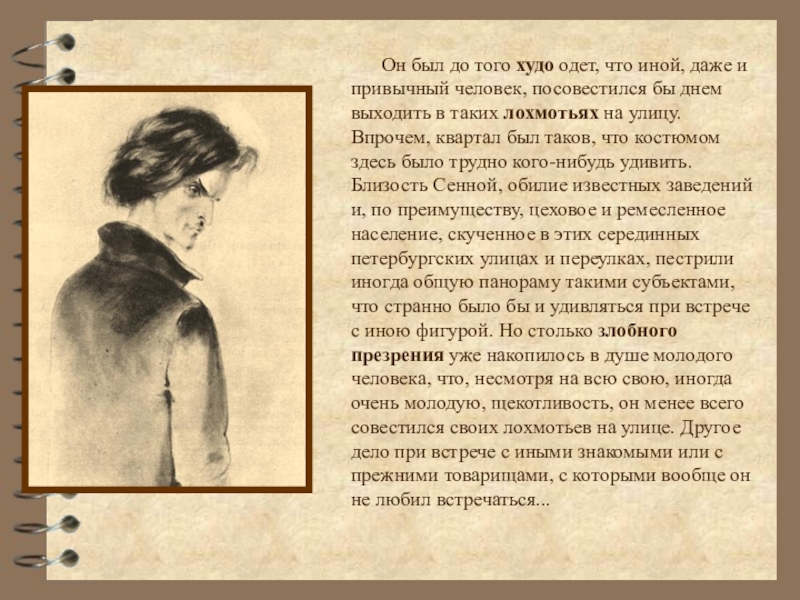 даже и привычный человек, посовестился бы днем выходить в таких лохмотьях на улицу. Впрочем, квартал был таков, что костюмом здесь было трудно кого-нибудь удивить. Близость Сенной, обилие известных заведений и, по преимуществу, цеховое и ремесленное население, скученное в этих серединных петербургских улицах и переулках, пестрили иногда общую панораму такими субъектами, что странно было бы и удивляться при встрече с иною фигурой. Но столько злобного презрения уже накопилось в душе молодого человека, что, несмотря на всю свою, иногда очень молодую, щекотливость, он менее всего совестился своих лохмотьев на улице. Другое дело при встрече с иными знакомыми или с прежними товарищами, с которыми вообще он не любил встречаться...