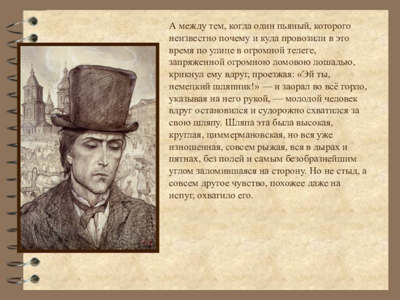 провозили в это время по улице в огромной телеге, запряженной огромною ломовою лошадью, крикнул ему вдруг, проезжая: «Эй ты, немецкий шляпник!» — и заорал во всё горло, указывая на него рукой, — молодой человек вдруг остановился и судорожно схватился за свою шляпу. Шляпа эта была высокая, круглая, циммермановская, но вся уже изношенная, совсем рыжая, вся в дырах и пятнах, без полей и самым безобразнейшим углом заломившаяся на сторону. Но не стыд, а совсем другое чувство, похожее даже на испуг, охватило его.