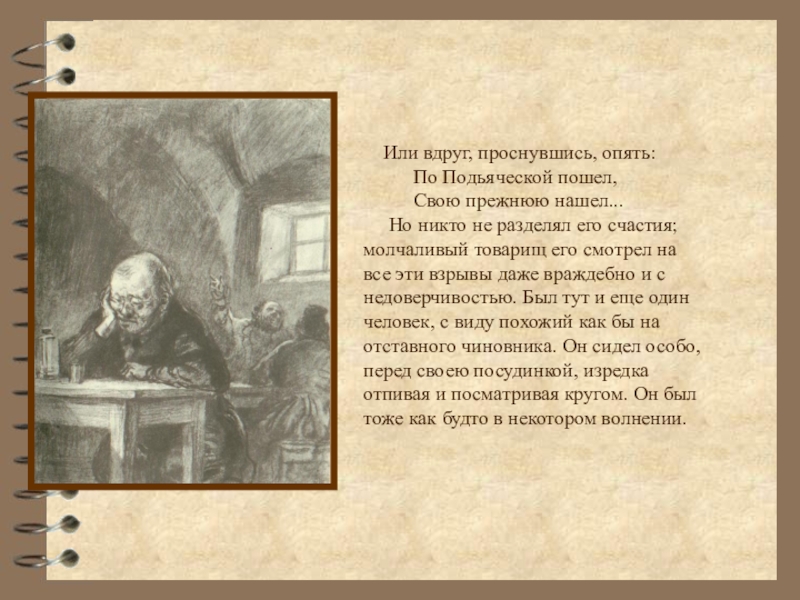 Но никто не разделял его счастия; молчаливый товарищ его смотрел на все эти взрывы даже враждебно и с недоверчивостью. Был тут и еще один человек, с виду похожий как бы на отставного чиновника. Он сидел особо, перед своею посудинкой, изредка отпивая и посматривая кругом. Он был тоже как будто в некотором волнении.