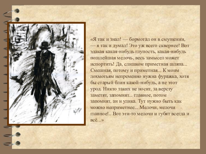 так и думал! Это уж всего сквернее! Вот эдакая какая-нибудь глупость, какая-нибудь пошлейшая мелочь, весь замысел может испортить! Да, слишком приметная шляпа... Смешная, потому и приметная... К моим лохмотьям непременно нужна фуражка, хотя бы старый блин какой-нибудь, а не этот урод. Никто таких не носит, за версту заметят, запомнят... главное, потом запомнят, ан и улика. Тут нужно быть как можно неприметнее... Мелочи, мелочи главное!.. Вот эти-то мелочи и губят всегда и всё...»