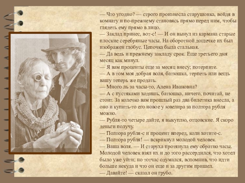 — Так вот-с... и опять, по такому же дельцу... — продолжал Раскольников, немного смутившись и удивляясь недоверчивости старухи.