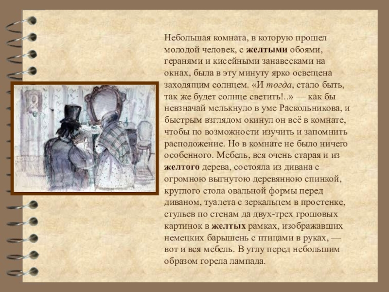 Слайд 17Небольшая комната, в которую прошел молодой человек, с желтыми обоями, геранями
