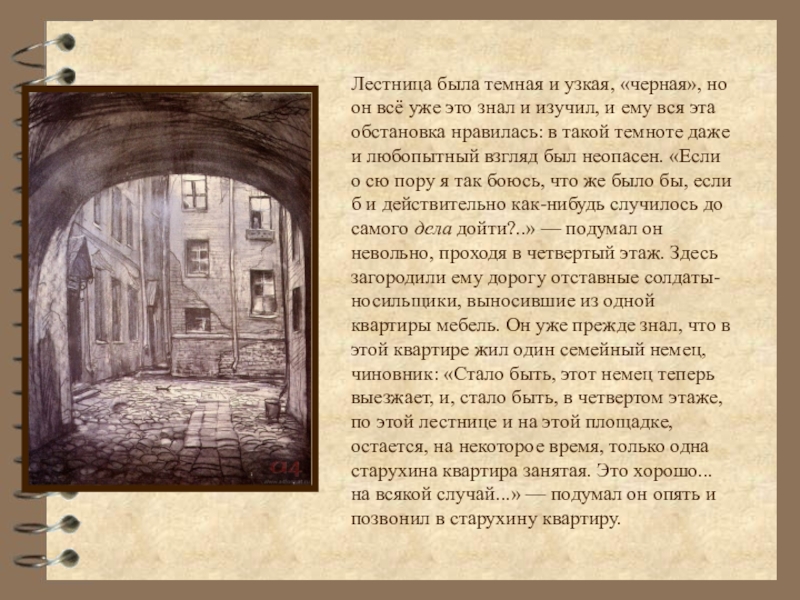 Слайд 13Лестница была темная и узкая, «черная», но он всё уже это