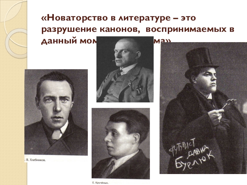 Слайд 4«Новаторство в литературе – это разрушение канонов, воспринимаемых в данный момент