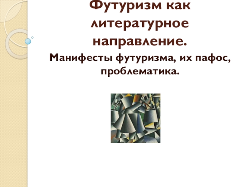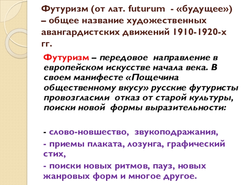 Футуризм – передовое направление в европейском искусстве начала века. В своем манифесте «Пощечина общественному вкусу» русские футуристы провозгласили отказ от старой культуры, поиски новой формы выразительности: