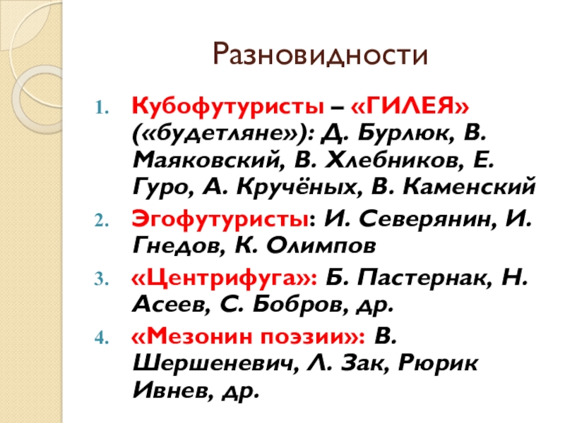 Кубофутуристы – «ГИЛЕЯ» («будетляне»): Д. Бурлюк, В. Маяковский, В. Хлебников,